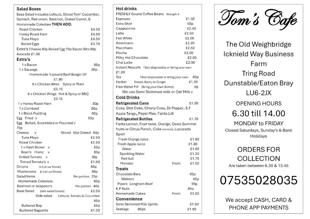 Tom's Cafe Dunstable sits at Business Farm, 25 Icknield Way, Tring Rd, Dunstable, LU6 2JX. It’s conveniently nestled near the Eaton Bray roundabout, making it easily accessible. The cafe draws in locals from surrounding areas who appreciate its friendly service and homemade fare. Entering the cafe, you’re greeted by a cozy decor that feels like home. The outdoor seating provides a lovely view of Dunstable Downs, perfect for enjoying your meal on sunny days.